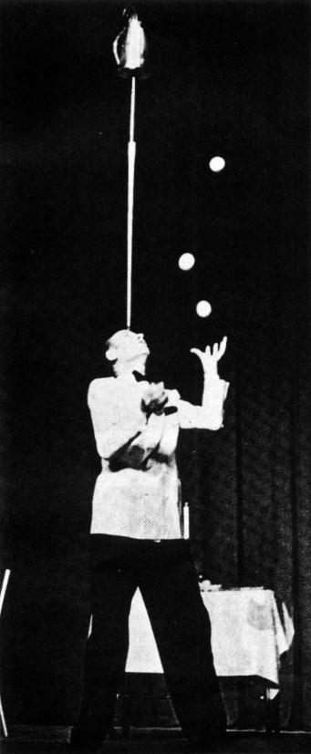 Adonos said most juggling today bores him. "It's all too similar, when I was juggling it was a law to be creative." And creative he was! In one trick he balanced a pool cue on his forehead with a coffee pot perched on top of it. While juggling three balls he would throw one up to open the lid of the coffee pot. The next one went into the coffee pot and closed the lid behind itself!