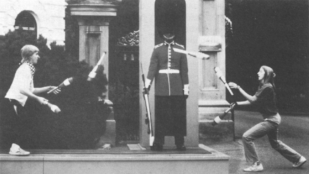 Chin up, old chap! David Aiken and Susan Kirby pass clubs around a guard at the Government House in Ottawa, Canada. (Jean Ringuette photo)