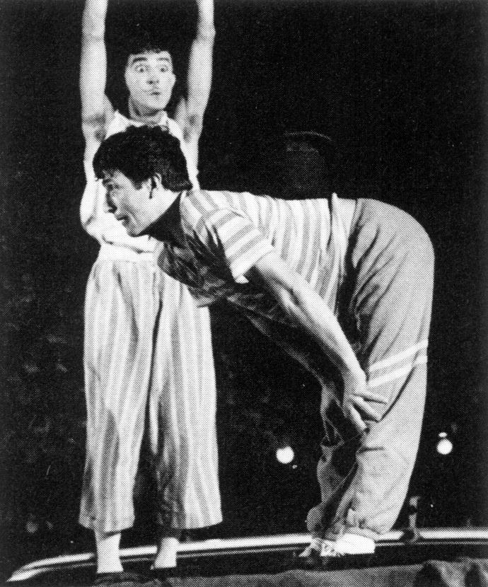 The two evenings of entertainment there showcased the variety of talent on hand: Spanish unicyclists Ramon Boni and Jordi Caroli; Italian acrobats, mimes and magicians Salvatore Mereu and Claudio Madie; American huge-loop rope spinner David Lichtenstein; the M.C.'s Moshe and Andre Vincent (a.k.a. 'Arry Pavarotti), who shared native expertise in the lingua franca of the convention - English; the Danish comic acrobatic couple Maj-Britt Hansen and Uffe Dittmer (a.k.a. Die Glade Artisten); shocking and sensual acrobatic dancers Martin van Bracht and Sabine Rieck (a.k.a. Die Kempovsky); more hard-edged Berlin-style cabaret entertainment from tuxedoed robot-mime Detlef Winterberg; and many more.