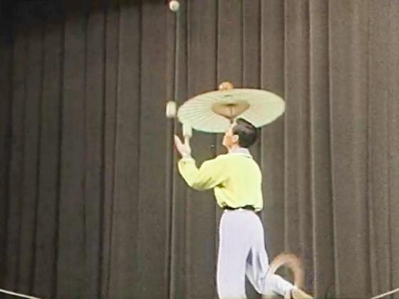 in one hand, while juggling 3 balls in his other hand. This act lasted