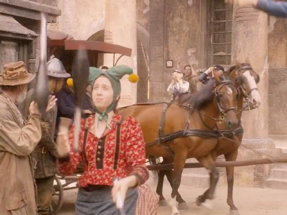 At 2:40:22, a woman jester juggles 3 clubs in a small parade, seen 3
