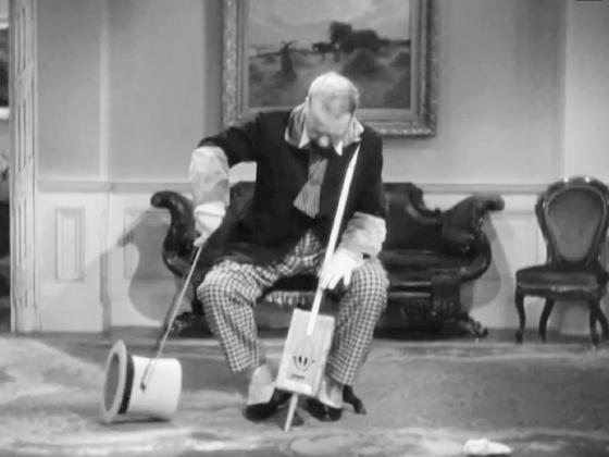 At 59:46, Fields performs a 3 minute 30 second routine featuring rolling a hat around him on the floor.