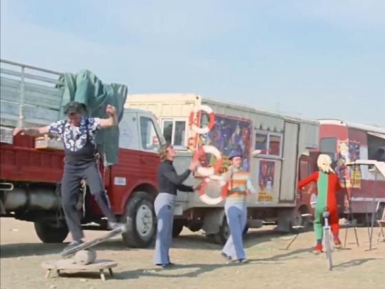 the background, one juggling 3 clubs and the other juggling 3 rings.